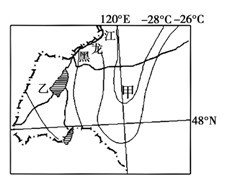 (1)图中甲一乙天气系统是?,若该天气系统30小时后到达①地,简要说明①地在未来30小时内风向、风力及天气的变化趋势。(4分)