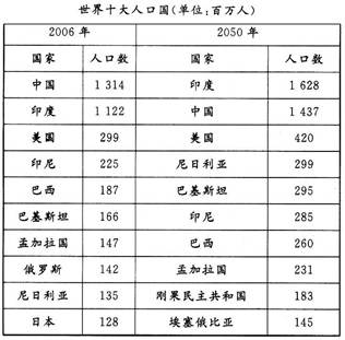 (1)2006年的口大国在2050年排位跌出前10位的是______和_____,其位次变化的原因________。
