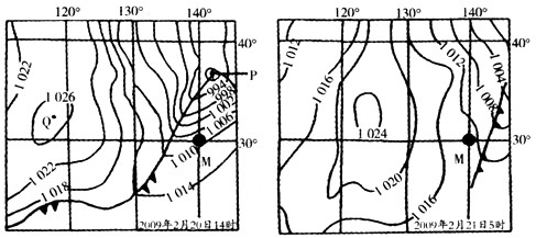 2、图示时间段内,关于M地的描述正确的是①偏南风转偏北风②风力减弱③天气晴朗④气温降低