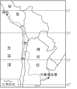 4、单选题 达喀尔拉力赛是世界上最严酷和最富有冒险精神的赛车运动。第34届达喀尔拉力赛于2012年1月期间在南美阿根廷、智利、秘鲁三国举行。完成下题。