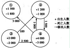 1、单选题 读下面“人口相等的四座城市某年人口变动资料图”,完成38—39题。
