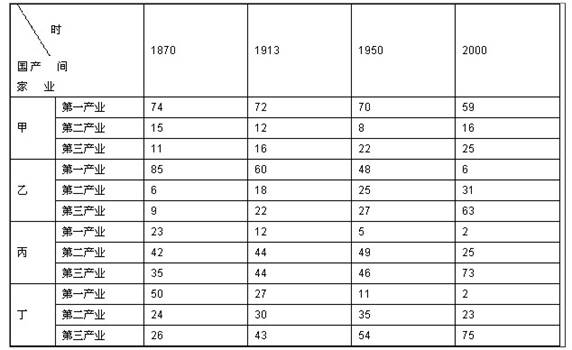 3、单选题  下表为英国、美国、日本和印度四个国家1870年至2000年各级产业人口比例(%)的变化资料。试回答各题。