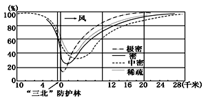 小题1:各曲线的最低点越低说明减弱效果越明显;最低点到“三北”防护林的距离为减弱风力的范围。读图可知极密林减弱的风速最小,但减弱风速的范围较小投资较大,生态效果欠佳。稀疏林减弱风速的能力最小,减弱风速范围也不大。中密林减弱风速的范围最大也经济合理,生态效果也好。
