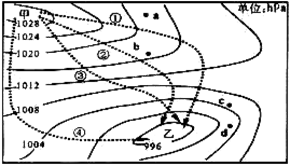 1.下图中从甲地到乙地的气流方向,正确的是2.此时,图中 a、b、c、d 四地最有可能出现阴雨天气的是