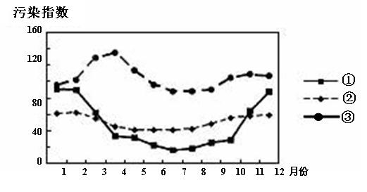 本题解析:图中得出污染物①在冬季指数高,由于该地在我国华北地区,从而得出居民冬季生活用能(燃煤)过多导致二氧化硫排放过多。故选B