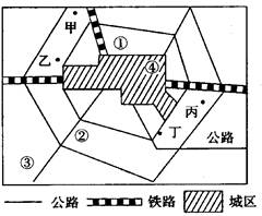 1.若图中甲、乙、丙、丁均是有空气污染的工厂,这种工业布局方式最适宜在2.图中①~④产业布局不合理的是