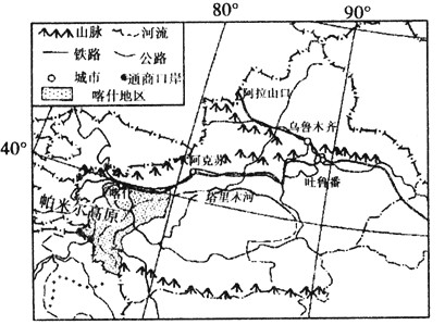参考答案:(1)共同点:多沿铁路线分布。不同点:喀什所在地区的城市多分布在山麓和绿洲上;深圳所在地区的