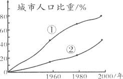 2、综合题 图为“世界发达国家与发展中国家城市人口占总人口比重变化曲线图”,读图完成下列问题。(7分)