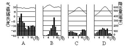 本题解析:根据四图的气温和降水量分布特征判断,A图终年高温多雨,为热带雨林气候;B图终年高温,降水量集中于夏季,故判断为热带草原气候;C图雨热不同期,故判断为地中海气候;D图最低月温在0°C以上,降水量集中于夏季,故判断为亚热带季风气候,而上海市受亚热带季风气候影响。