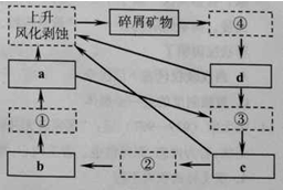 图中a、b、c、d字母所代表的是三类岩石和岩浆,根据三类岩石的转化条件,可以判断,碎屑物质经过固结成岩作用形成沉积岩,d为沉积岩。沉积岩不能直接变成岩浆岩,却能经过变质作用形成变质岩,所以c是变质岩。变质岩高温融化形成岩浆,所以b是岩浆。a是冷凝作用形成的岩浆岩。花岗岩属于岩浆岩的一种,所以A对。B、C、D错。
