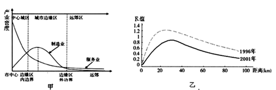 5、单选题 甲图为北京制造业、服务业空间分布模式图,乙图为1996年、2001年北京市制造业人口密度与服务业就业人口密度比值(R值)的空间分布图,读图回答下列各题。