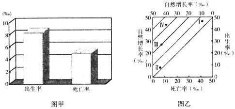 2、单选题  图甲表示“我国2008年某市人口出生率和死亡率”,图乙为“我国不同阶段人口增长状况图”,读图回答1~3题