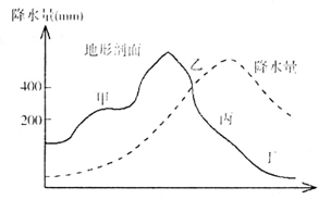 小题1:降水量大于400mm为森林景观,从甲乙丙丁四地分别向降水量曲线作垂线,与降水量曲线相交于一点,从交点作水平线,与纵轴相交,读数值大小,降水量大于400mm,则景观为森林,所以C对、A、B、D错。
