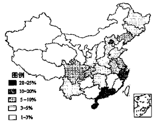 (2)海南旅游客源集中分布在我国东部沿海经济发达省份或尤以广东、浙江、辽宁、上海、北京等省市比例较高。(2分)三亚市位于海南岛南端,相对于我国大陆地区距离遥远,交通成本较高。因而,客流集中分布在我国东部沿海经济发达地区。(2分)