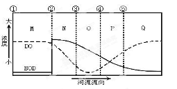 5、单选题 溶解氧DO是指溶解于水中的氧的含量,是衡量水质的重要指标。生化需氧量BOD是微生物分解水中的有机物体时需要消耗氧的数量,它用于监测水体有机物的污染状况。该图为某河由M河段至Q河段水中溶解氧和生化需氧量浓度变化曲线。据些完成问题。