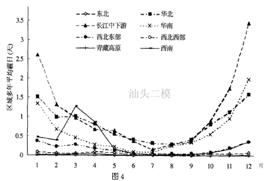 5、单选题 霾是一种对视程造成障碍的天气现象,大量极细微的干尘粒等均匀地浮游在空中,使水平能见度小于10km。有人也将之称为灰霾天气 。读我国“各区域1971-2000年平均霾日数变化”图(图4),回答下列2题。
