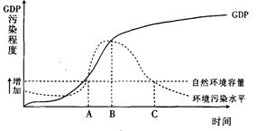 小题1:直接读图,从图中可以看出A阶段以前环境污染与经济发展水平都较低。A~B阶段环境污染程度与经济发展水平同步增长,B~C阶段由于人类对环境问题的深刻认识,被迫改变经济增长方式以谋求人地关系的和谐,环境污染程度逐步降低。