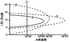 3、单选题 下图中①②③④四根曲线分别表示四地6月22日太阳高度的全天变化情况。判断四地纬度位置与图示相符合的是
