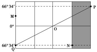 5、综合题 下图中阴影部分日期与其他地区不同,PQ为昼夜半球分界线,读图回答下列问题。(20分)