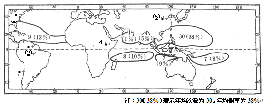 小题1:该地理现象的描述方式是年均多少次,说明平均每年都发生。而且主要分布区域位置固定,在副热带地区,可以判断是台风。台风是热带气旋的一个类别。在气象学上,按世界气象组织定义:热带气旋中心持续风速在12级至13级(即每秒32.7米至41.4米)称为台风。热带气旋是发生在热带或副热带洋面上的低压涡旋,是一种强大而深厚的热带天气系统。它像在流动江河中前进的涡旋一样,一边绕自己的中心急速旋转,一边随周围大气向前移动。