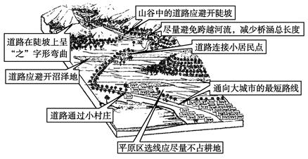 点评:本题难度较小,属于基础知识的考查,地形因素对线路具体走向影响很大,线路应尽量避免穿过地形地质条件复杂、自然灾害多发的地区,尽量避免穿越河流。