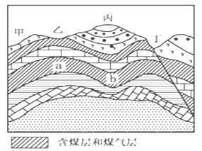 (1)读图,根据岩层的形态判断,乙处岩层向上拱起,是背斜构造,丙处岩层向下凹,属于向斜构造,丁处岩层有明显的错动和位移 ,是断层构造。