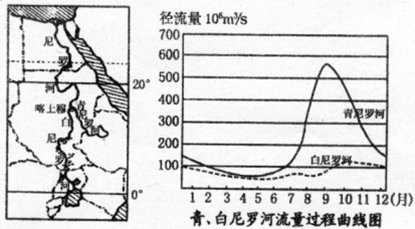1、综合题 图为尼罗河水系及主要干支流流量过程曲线图,读图回答问题。