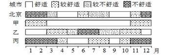 本题解析:甲地四季舒度都较高适,其中一年中有8个月左右的时间非常舒适,应该为四季如春的昆明;乙城市冬季舒适度高,说明气候较炎热,纬度低;丙城市夏季舒适度较高,说明气候较寒冷。综合四个选项,应选答案B.