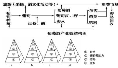 小题2:该产业的结构流程包括原料种植、采摘、加工、产品销售、旅游等产业环节,因而在生成过程中是以农业为基础,产业部门较多,而且工业产品间有密切的生产联系;同时在终端有废品回收,所以该产业链基本实现了无污染排放,但是葡萄种植、生产具有地域性和季节性,故选项C符合题意。