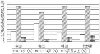 5、单选题 读“2007年中国、老挝、韩国和俄罗斯人口年龄构成统计图”,回答问题。