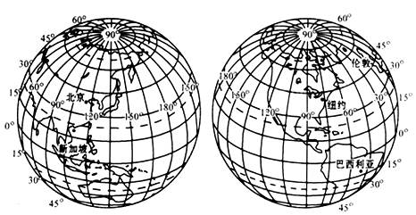 【小题1】图中的北京、新加坡、纽约和巴西利亚四个城市中位置完全符合西半球、南半球、低纬度地区三个条件的是( )