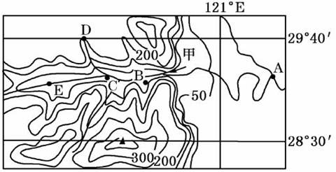 1、综合题 下图为“我国某地地形图”,图中A、B、C、D、E为居民点,回答下列问题。