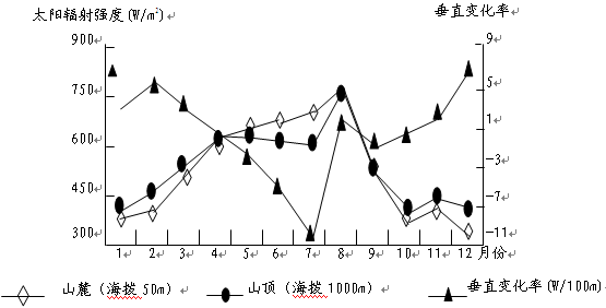 1.有关该地太阳辐射强度的叙述,正确的是2.关于该地太阳辐射垂直变化的叙述,正确的是3.该地太阳辐射强度最大的月份不是6月,而是8月,其主要原因可能为8月