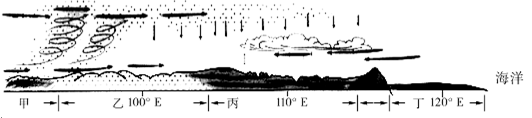 1.丙地区地貌的典型特点是2.图中的向右和向左的风,在各自盛行的时候,风向分别是3.地形单元丁在太行山以东,其北界和南界分别是