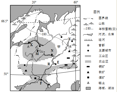 材料二:图中R河是内流河,以积雪融水补给为主。R河流经的甲平原是所在国政治、经济的核心区域,人口约1亿。
