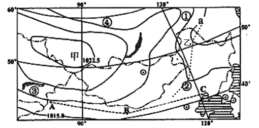 (3)虚线②所在处出现的天气系统是 ,在它影响下C地区在夏季容易出现的气象灾害是