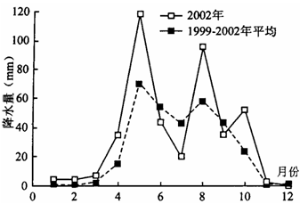 小题2:图示区域2002年与1999-2002年平均相比(?)
