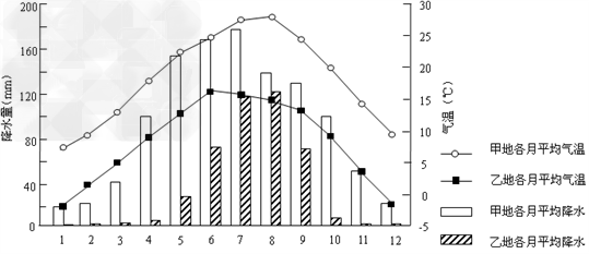 2、单选题 我国甲、乙两地均位于29 °N 附近。读“1971 ~2000 年甲、乙两地各月平均气温和降水分布图”,可知