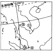 小题1:图示①②位于中南半岛,为热带季风气候,而③④位于赤道附近,为热带雨林气候,故选B项。
