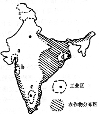 小题4:a是印度的阿默达巴德工业区,这里接近印度的棉花、油料产地,发达的农业为工业提供丰富的工业原料,促进了工业的发展,属于印度的传统工业区,主要工业部门有棉纺织工业、油脂工业等。b是印度的孟买一浦那工业区,是一个综合性的工业基地,主要工业部门有棉纺工业、机械工业、化学工业、石油冶炼工业等,初步形成了比较完整的工业体系。c是印度的马德拉斯一班加罗尔工业区,是—个以新兴工业为主的工业区,主要工业部门有电力工业、飞机制造、造船工业、石油冶炼、电子工业、电机制造工业等。d是印度的那格浦尔工业区,它是20世纪50年代发展起来的传统工业区,被誉为印度的“鲁尔”区。接近煤炭、铁矿产地,属于“煤铁复合体型”工业布局。煤炭、钢铁产量占印度煤炭、钢铁总产量的75%。在此基础上,还发展了电力工业、机械工业、化学工业等。在d的东部还有一个加尔各答工业区,是印度形成最早、规模最大的工业区,是印度的麻纺织工业中心、机械制造工业中心。加尔各答是印度最大,也是南亚最大的城市。故选D