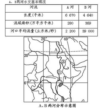 (1)根据图示的经纬度位置和海陆轮廓判断,图示表示非洲北部。A位于河流入海口,故由于流水沉积而形成河口三角洲;河流在出山口的地带,由于落差大,且B河流流量大,故有丰富的水能资源。