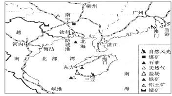 小题1:从图中可以看出北部湾地区有丰富的煤矿、石油、天然气、盐场等资源,珠三角地区矿产资源贫乏,D对。