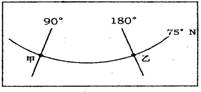 3、单选题 下图是经纬网局部图。某时刻,甲地正在日出,乙地正在日落。读图回答下列问题。