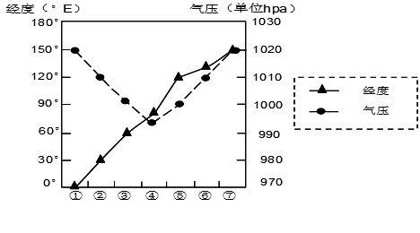 3、单选题 图中①~⑦为某月北纬31°纬线上7个地点的气压分布图。读图,完成题。