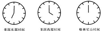 小题2:到达美国后,酒店大堂悬挂着三个大钟(如图所示),这时北京时间可能为?(?)