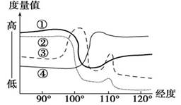 3、单选题 读“沿我国30°N分布的四地地理要素度量值变化趋势图”,回答问题。