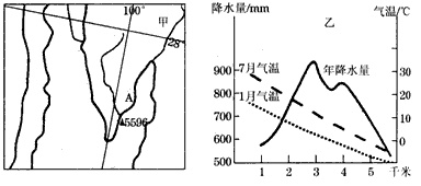 5、单选题 下图中甲图为我国某区域图,乙图为甲图中5596米山地的气温、降水与高度的关系。回答1—3题。