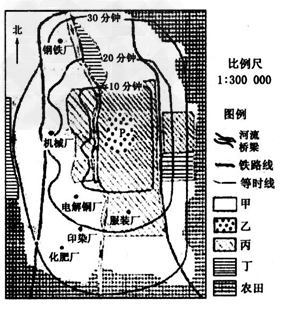 4、单选题 下图为华北某城市功能分区和等时线示意图。图中等时线是指汽车从城市P点向外行驶所用时间相等点的连线。读图,回答(1)~(3)题。