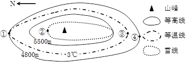 【小题2】图中③、④两地所在山坡雪线低,说明是迎风坡,结合指向标分析,温度比同一海拔高度的北坡高,说明南坡是阳坡,A对。