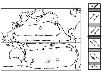 (1)盛行风是海洋水体运动的动力。判断图中①~⑦处洋流在西风驱动下形成的有 ,在信风推动下形成的有 (4分)